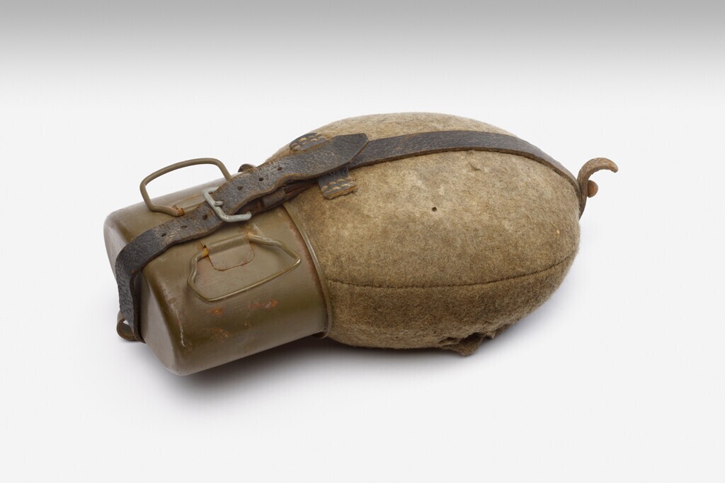 Een Duitse militaire metalen veldfles met bruin vilt overtrokken. Over de dop van de veldfles een bijhorende groene metalen mok met leren riempjes aan de veldfles vastgemaakt. Aan de leren riempjes een haak om de veldfles met mok vast te maken rechtsachter aan de koppel op de broodzak behorend tot de militaire uitrusting.