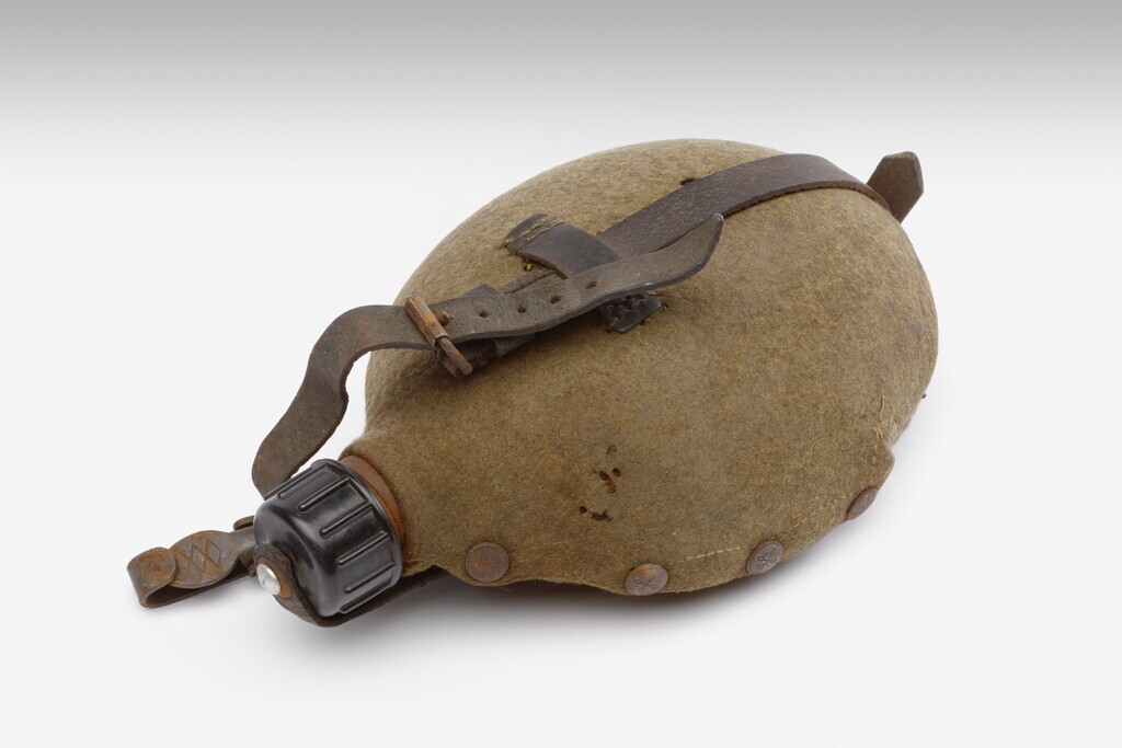 Een Duitse militaire metalen veldfles met bruin vilt overtrokken. Over de dop hoort een groene metalen mok die met de wel aanwezige leren riempjes aan de veldfles wordt vastgemaakt. Aan de leren riempjes een haak om de veldfles met mok vast te maken rechtsachter aan de koppel op de broodzak behorend tot de militaire uitrusting.