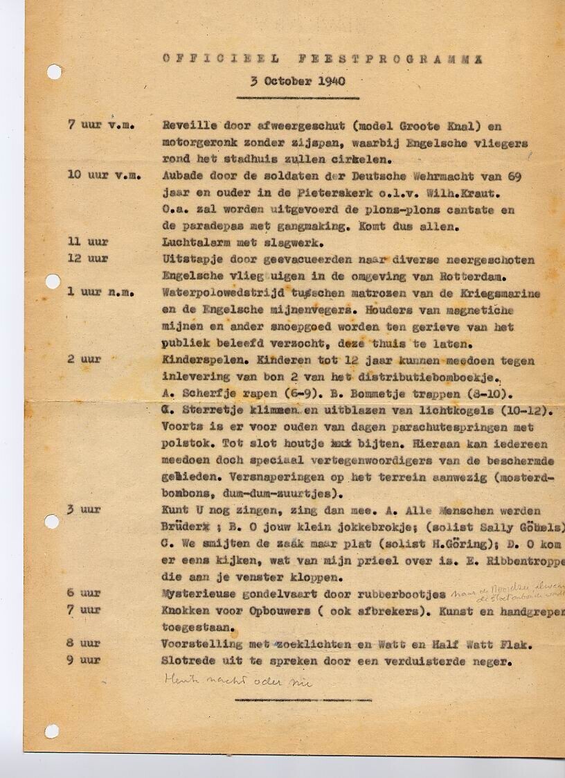 Gestencild feestprogramma voor de Leidse 3 oktoberfeesten met anti Duitse inslag.