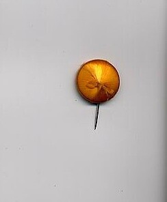 Een verzetsspeldje in de vorm van een rond met oranje kunstzijde overtrokken plaatje met aan de achterkant een speld.