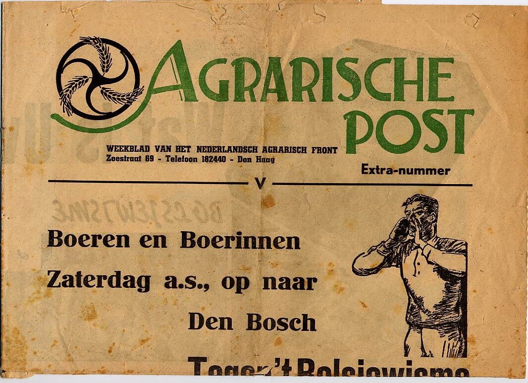 Extra nummer van de Agrarische Post een weekblad van het pro-Duitse Nederlandsch Agrarisch Front. Het blad bevat een scherpe aanval op het Bolsjewisme en een oproep om voor een protest naar Den Bosch te komen op zaterdag 2 augustus 1941. De titel is in het groen gedrukt. Rechts een roepende figuur. Linksboven het embleem van het Nederlandsch Agrarisch Front: aren in een spiraalvorm.