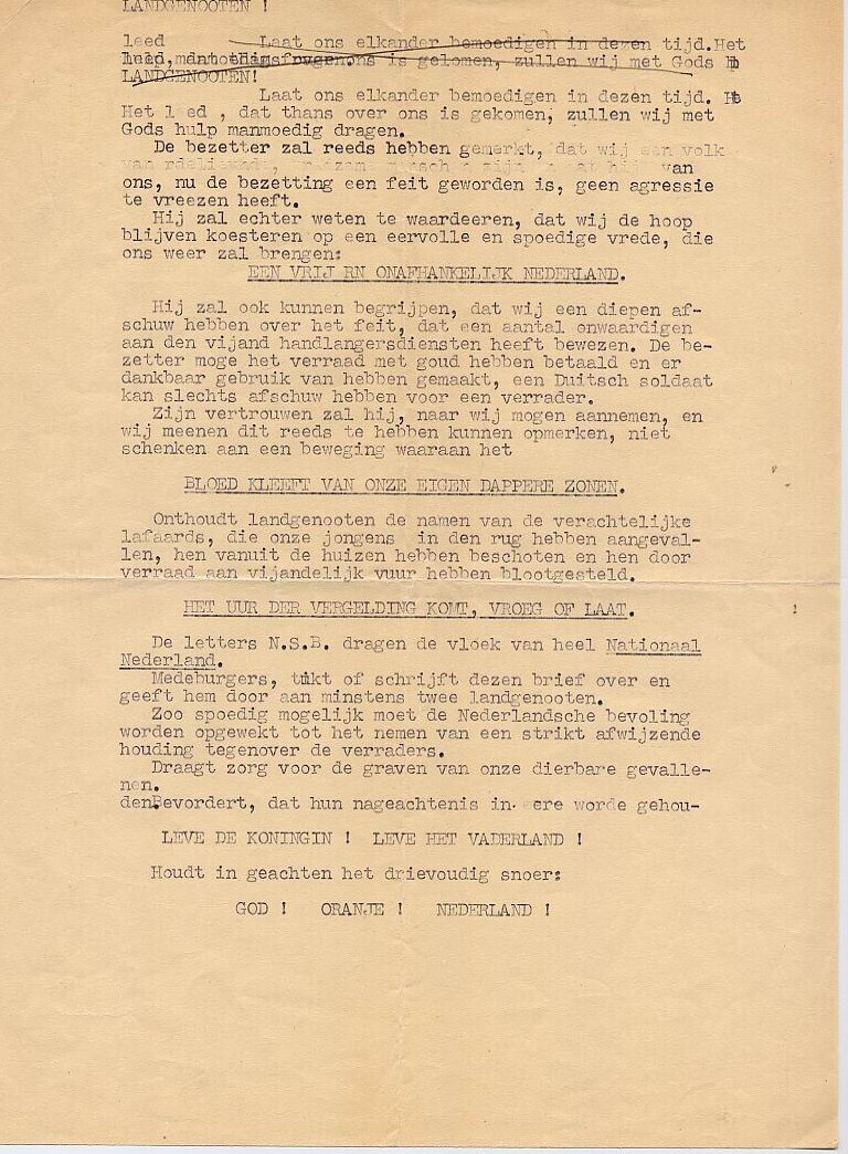 Getypt vlugschrift uit het verzet met daarin de oproep de brief over te schrijven of te typen en door te geven aan minstens twee landgenoten.