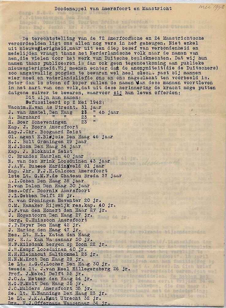 Een bericht over de terechtstelling van 96 veroordeelden uit Amersfoort en Maastricht met aan het eind een gedicht als troostwoord. Twee stencils met de namenlijst.