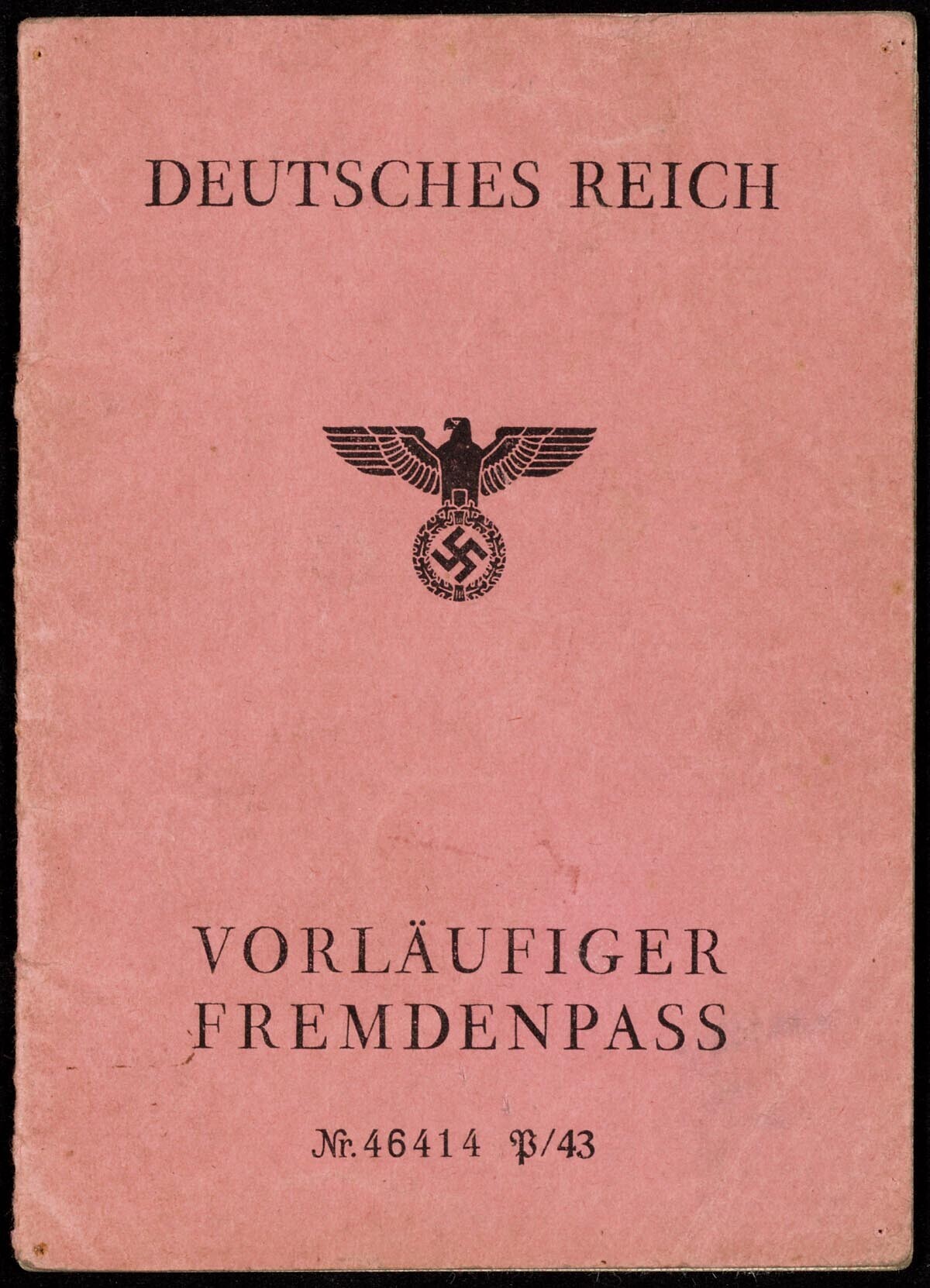 Een gedrukt papieren boekje met roze kaft. Op de kaft: "Deutsches Reich Vorläufiger Fremdenpass" en de afbeelding van de Duitse Adelaar met in de klauwen het hakenkruis. De pas is uitgegeven op naam van Albert Struijk uit Nederland, werkzaam als "Hilfsarbeiter" te Dortmund. De pasfoto ontbreekt.<br>