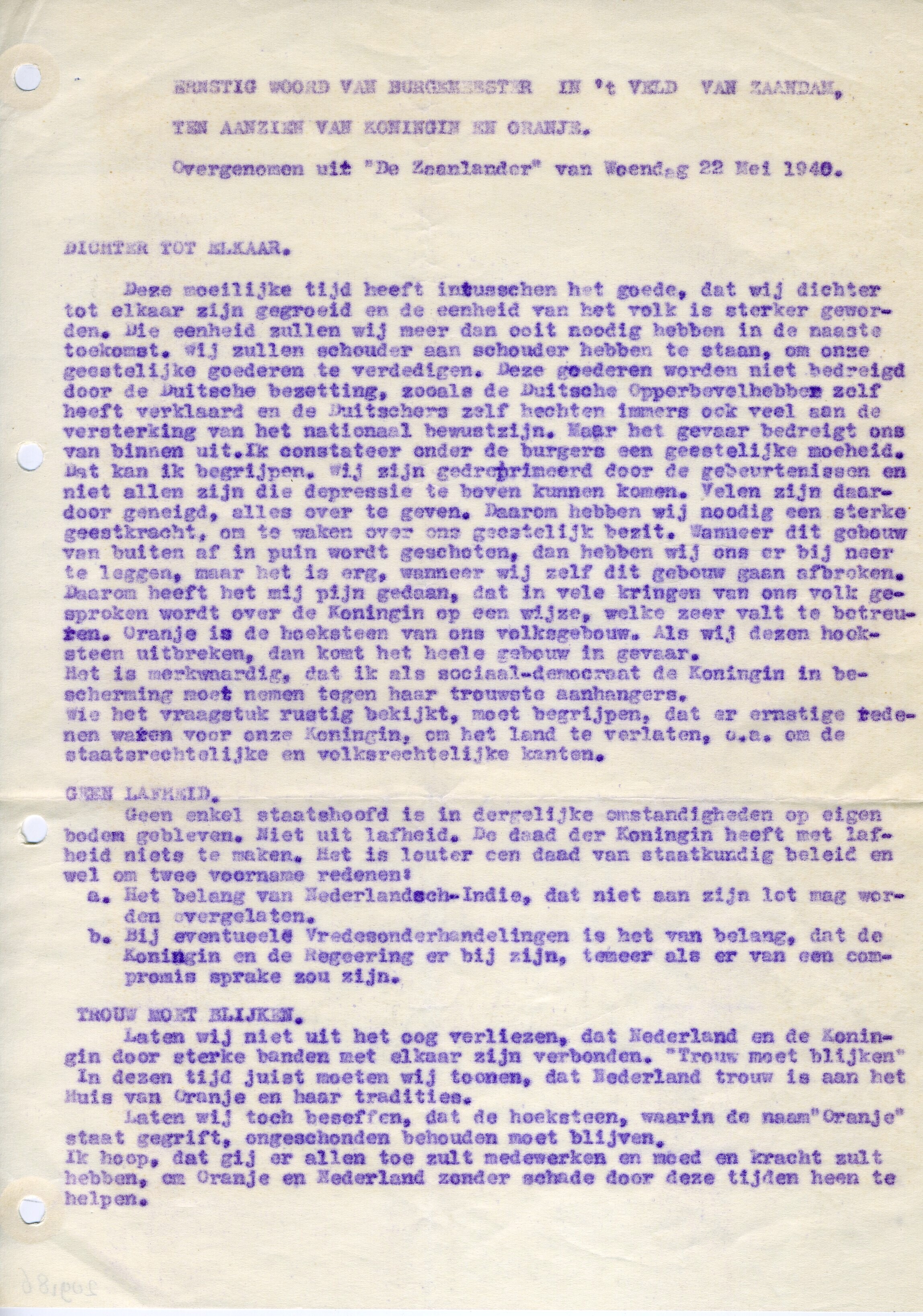 Een paars gedrukt stencil met de tekst van een toespraak van de burgemeester van Zaandam overgenomen uit de Zaanlander.
