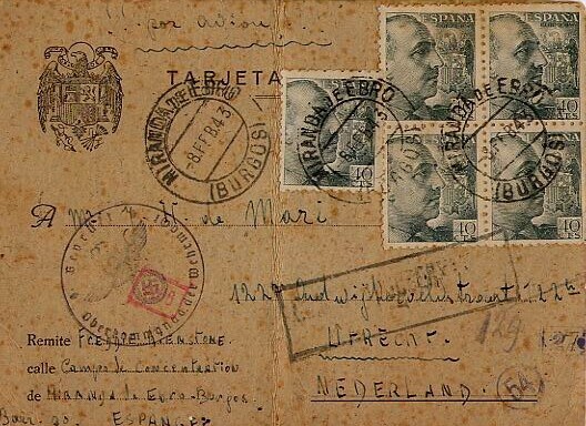 Vijf enveloppes en een briefkaart die gecensureerd zijn: - een enveloppe van W.G. de Jong, Wohnlager 5 der I.I.W. te Spandau gericht aan Leen Dekker te Wassenaar. De enveloppe is afgestempeld: Berlin-Spandau 30-9-43 en 'A.c.'; - een enveloppe van Swan, Culbertson & Fritz te Hong Kong gericht aan Mr. J.J. van Voorthuysen te Den Haag. In de rechterbovenhoek staat: Dienstjaar 1939/40. De enveloppe is voorzien van een wit etiket op de zijkant met: "Opened By Censor"; - een enveloppe van Schiffer-Hüls-Gesellschaft 'Vater Rhein' te Mühlheim a.d. Ruhr gericht aan Mr. J.E. Schout te Rotterdam. De enveloppe is afgestempeld: Duisburg 17-12-41 en voorzien van een wit etiket met: "Geöffnet Obercommando der Wehrmacht" met het symbool van het Derde Rijk; - een enveloppe van "Gefr. Moris(?)" te Kremsier (Mähren) gericht aan P. Bok te Leiden met rechtsboven "Feldpost". De enveloppe is afgestempeld: Kremsier 20-?-43 en voorzien van een wit etiket met: Geöffnet Obercommando der Wehrmacht" met het symbool van het Derde Rijk; - een deel van een enveloppe met het etiket van de censuur: Geöffnet Obercommando der Wehrmacht" met het symbool van het Derde Rijk; - een briefkaart van Freddie M(?)ienstone vanuit het concentratiekamp Miranda de Ebro-Burgos in Spanje aan J.H. de Mari te Utrecht afgestempeld: Miranda de Ebro Burgos 0-feb-43 en voorzien van het stempel: "Geprüft Obercommando der Wehrmacht".