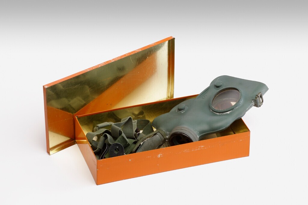 Gasmasker in een oranje blikken trommel, voorzien van legerkleurige katoenen en elastische banden me...