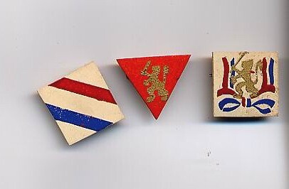 Drie reversspeldjes van kunststof: een vierkant speldje met diagonaal de kleuren van de Nederlandse vlag tegen een witte achtergrond; een vierkant speldje met de Nederlandse leeuw met een lint in de kleuren van de Nederlandse vlag; een driehoekig speldje met op een oranje achtergrond de Nederlandse leeuw.