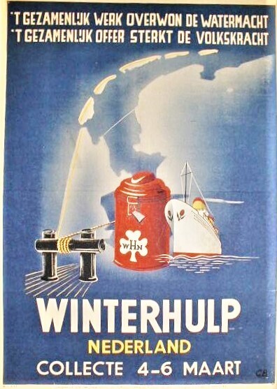 Een affiche (no. 33) van de Winterhulp Nederland met een oproep te doneren tijdens de collecte van 4 tot 6 maart 1944. Afgebeeld is in de kleuren rood, wit, blauw en geel van een schip naast een collectebus met het logo van de winterhulp verbonden aan wal tegen de achtergrond van de kaart van Nederland. Onderaan de uithangtijd: 20 februari - 7 maart 1944 en: "Departement van Volksvoorlichting en Kunsten".