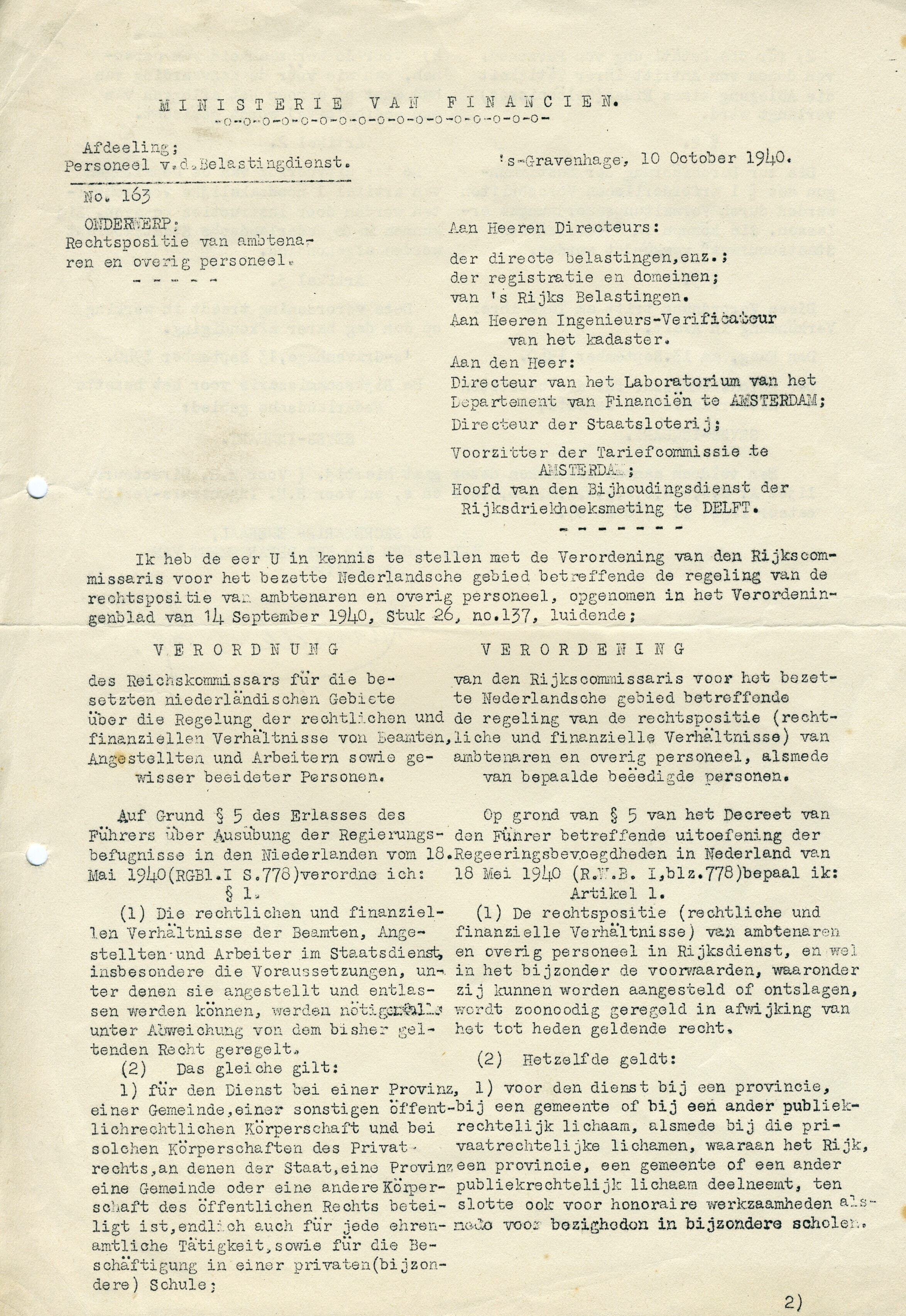 Een brief van het Ministerie van Financiën waarin de verschillende directeurs van belastingdiensten op de hoogte worden gesteld van de regeling (verordening) van de rechtspositie van ambtenaren.
