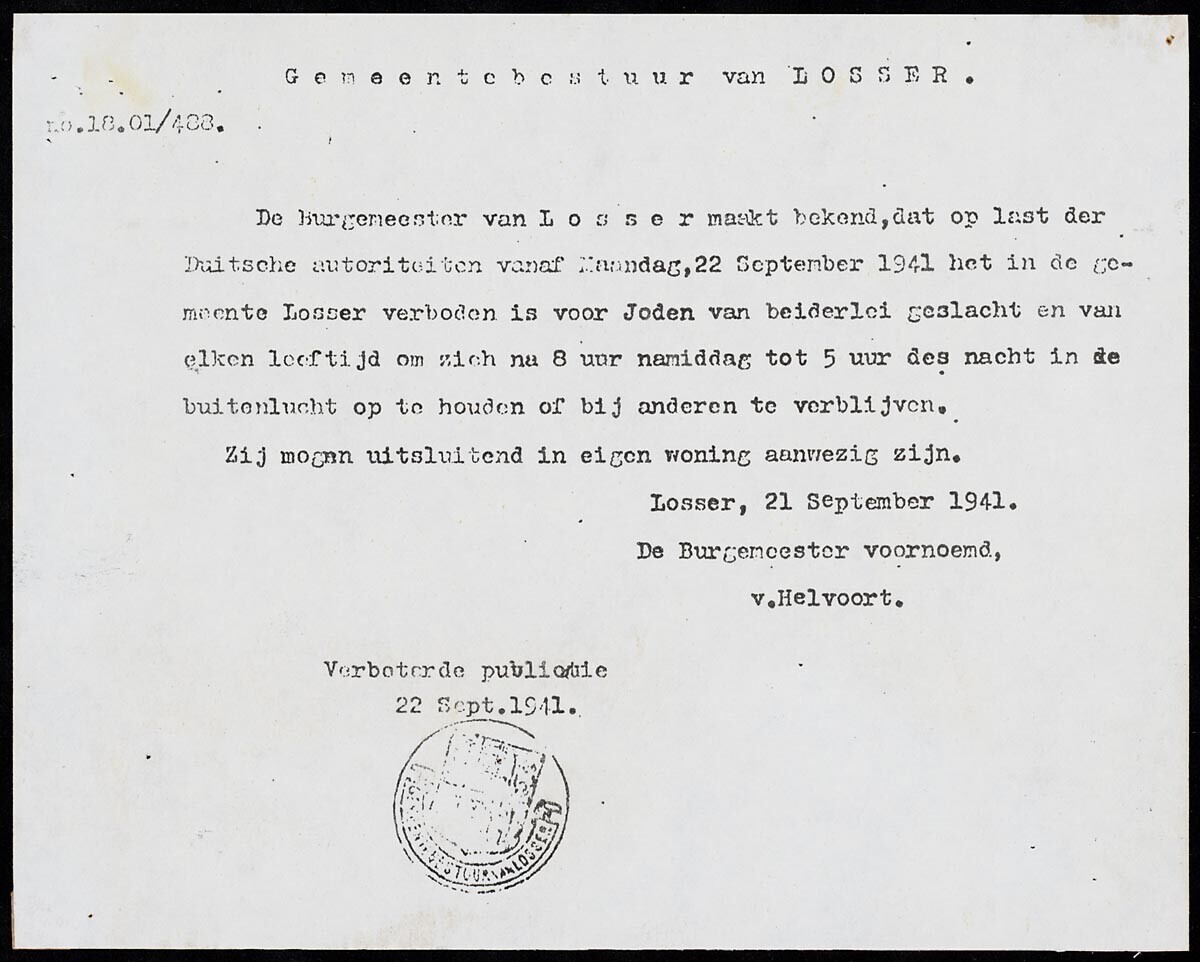 Een kopie van een circulaire voorzien van een stempel van de gemeente Losser, met een verbod voor Joden zich buiten te bevinden tussen 8 uur 's avonds en 5 uur 's ochtends.