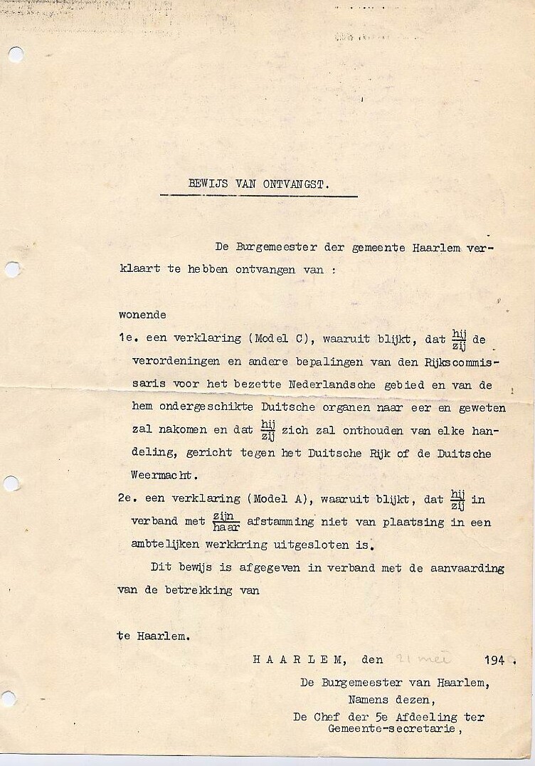 Een oningevuld gestencild bewijs van ontvangst door de burgemeester van Haarlem van diverse verklaringen waarbij de betrokken ambtenaar de bepalingen van de Duitse bezetter zal nakomen en door afstamming niet van plaatsing in een ambtelijke werkkring uitgesloten is.