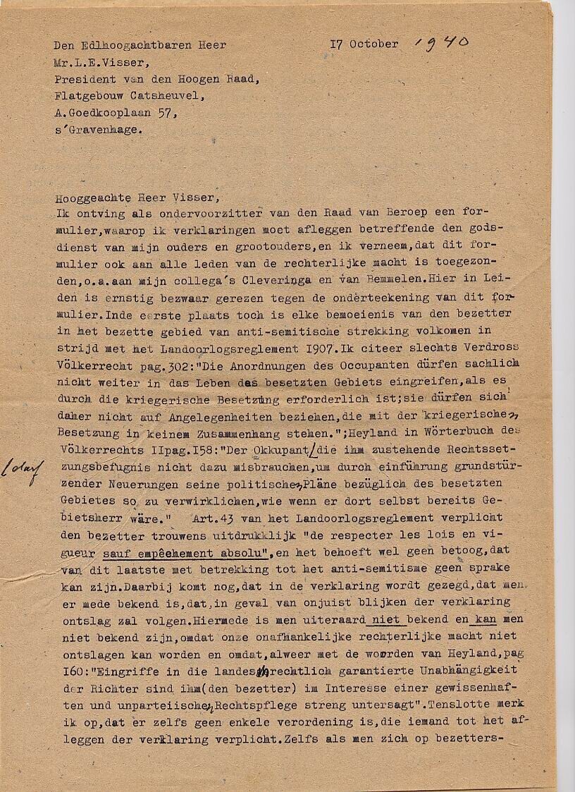 Een set briefafschriften van de correspondentie tussen leden van de Leidse universiteit en o.a. de President van de Hoge Raad, met betrekking tot het beroep tegen het afleggen van een godsdienstverklaring.
