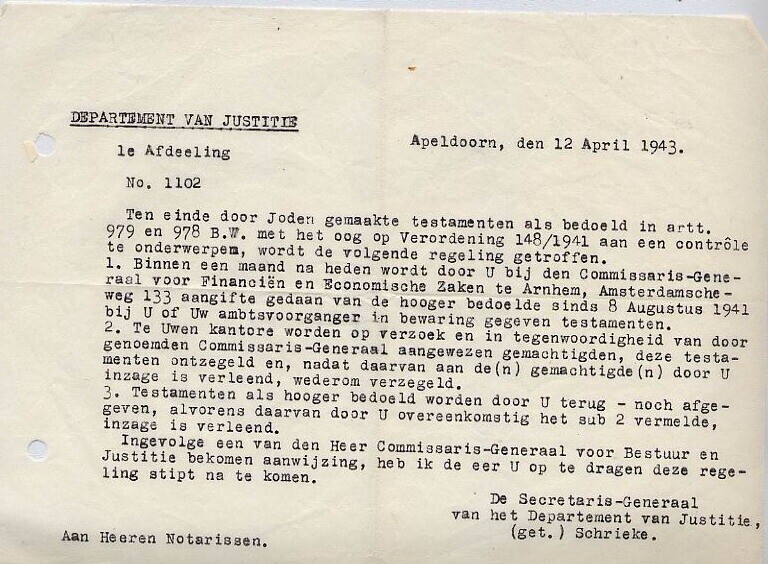 Een doorslag op vliespapier van het Departement van Justitie, gedateerd: Apeldoorn, 12 april 1943, waarin melding wordt gemaakt van de controle op Joodse testamenten.