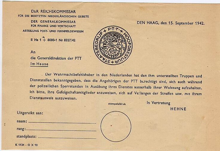 Blanco vergunning voor PTT-personeel dat zij zich voor de uitoefening van hun beroep in spertijd buiten hun woning mogen begeven.