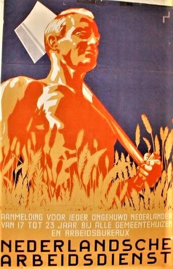 Wervingsaffiche van de Nederlandsche Arbeidsdienst met rode, oranje, blauwe, zwarte, witte en grijze opdruk. Afgebeeld is een man vanaf zijn middel met ontbloot torso. Hij draagt een spade over zijn schouder. Onderaan graanhalmen en de tekst: "Aanmelding voor ieder ongehuwd Nederlander van 17 tot 23 jaar bij alle gemeentelijke arbeidsbureaux".