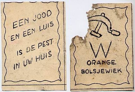Twee kleine pamfletten in eenzelfde stijl uitgevoerd. Een beschadigd exemplaar met de symbolen van Hamer en Sikkel en een grote "W" met daaronder: 'Oranje Bolsjewiek'. Het andere bevat de tekst: 'Een Jood en een luis is de pest in uw huis'.