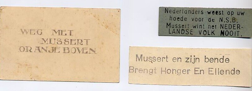Twee gestempelde pamfletjes met propaganda tegen Mussert met de teksten: "Mussert en zijn bende brengt honger en ellende; Nederlanders weest op uw hoede voor de N.S.B. Mussert wint het Nederlandse volk nooit" en een getekend kaartje met de tekst: "Weg met Mussert Oranje boven".
