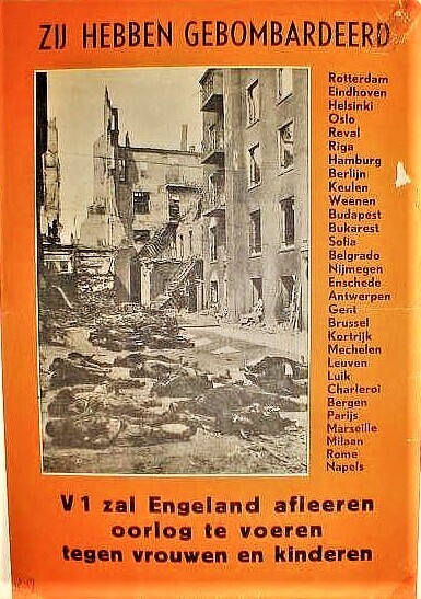 Een pro-Duitse affiche met kop: "". Hieronder een zwartwit foto van verwoeste gebouwen en doden op straat met daarnaast een lijst namen van steden die door de Engelsen gebombardeerd zijn. Onderaan: "V1 zal Engeland afleeren oorlog te voeren tegen vrouwen en kinderen".
