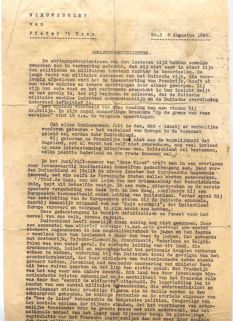 Een getypte "Nieuwsbrief van Pieter 't Hoen No. 3. 8 augustus 1940" over de "Oorlogsvooruitzichten".<br>