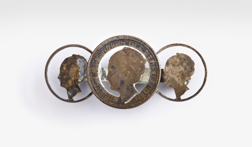 Een broche vervaardigd uit drie elkaar deels overlappende zilveren munten met het daarin uitgezaagde portret van Koningin Wilhelmina. Het gaat om twee dubbeltjes met daarop in het midden een kwartje. Bij het kwartje is de randtekst intact gelaten: "Wilhelmina Koningin der Nederlanden".