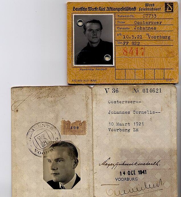 Een persoonsbewijs uitgegeven op 14 oktober 1941 door de gemeente Voorburg op naam van de heer J. C. Oosterveer met pasfoto. Tevens een Duits persoonsbewijs van de arbeidsinzet: "Deutsche Werke Kiel Aktiengesellschaft. Werk Friedrichsort" eveneens met pasfoto.