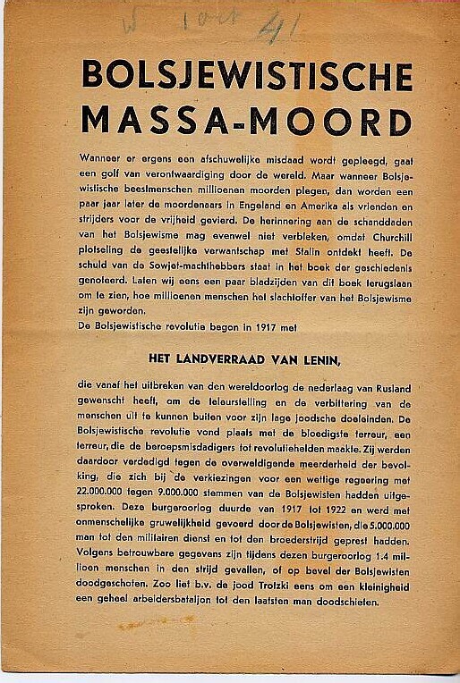 Folder van vier pagina's waarin een beschrijving wordt gegeven van de gruweldaden van het Sovjetregime. Met potlood is de datum 1 oktober 1941 vermeld.