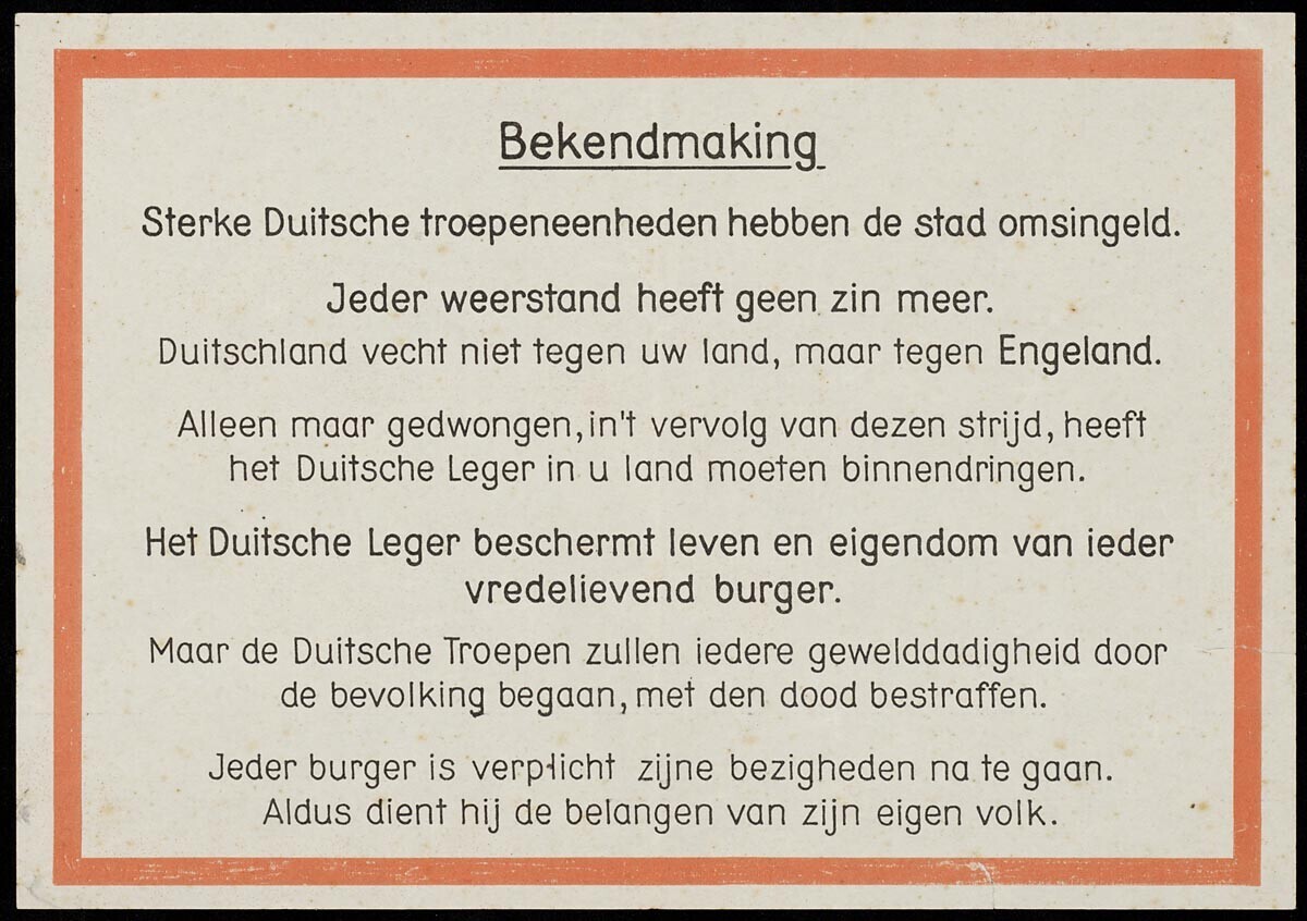 Twee pamfletten met de oproep om geen weerstand te bieden tegen het Duitse leger.