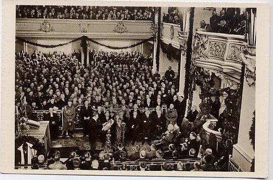 Een onbeschreven briefkaart met zwart-wit foto van de rede van Hitler in de Garnisonkirche te Potsdam.
