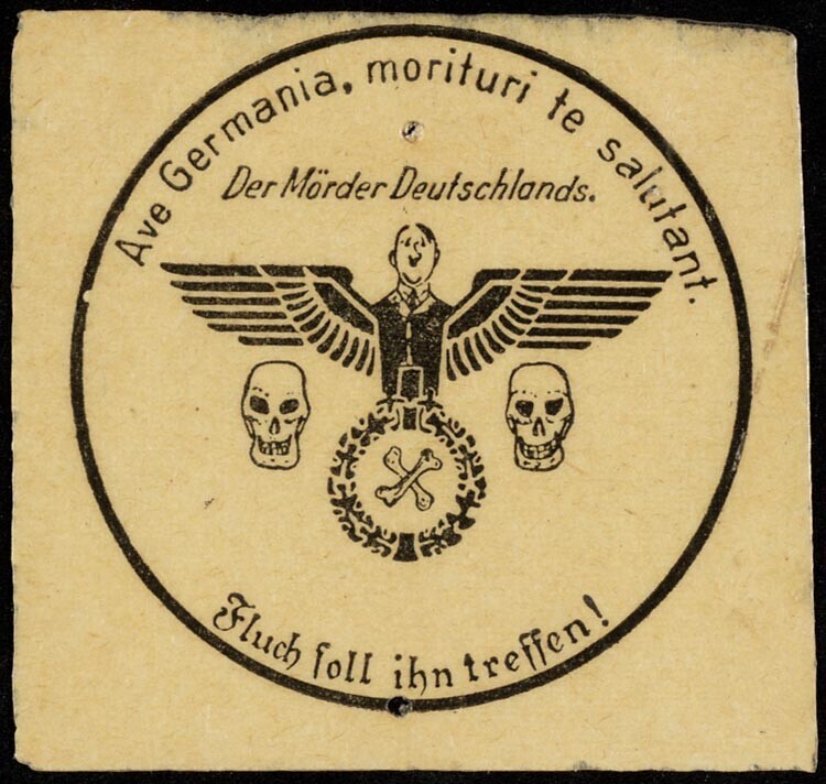 Twee vierkante stukken papier met daarop twee verschillende zwarte stempels vervaardigd door het Duits verzet tegen Hitler. Ze werden gestempeld op Duits propagandamateriaal in april 1945. Een rond stempel met Hitler verwerkt in het wapen van Nazi-Duitsland waarbij het hakenkruis is vervangen door kruislings getekende botten. Het 'wapen' wordt geflankeerd door twee doodshoofden. Bovenaan de tekst: "Ave Germania, morituri te salutant. Der Mörder Deutschlands." De andere bestaat uit een vierkant stempel met de afbeelding van de Duitse Rijksadelaar met een geweer waaruit een witte vlag steekt Onder hem een brandende ruïne waarin een hakenkruis is afgebeeld. Bovenaan de tekst: "Die einzige Rettung Deutschlands" en onderaan: "Besser leben für Deutschland als sterben für Hitler!"