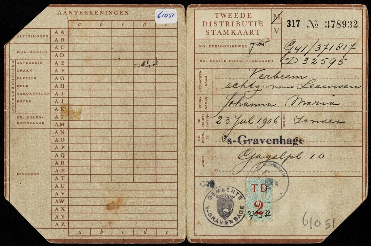 Een "Tweede Distributie Stamkaart" met het nummer 378932 op naam van Johanna Maria Verbeem echtgenote van Vaan Leeuwen met geboortedatum 23 juli 1906, wonende op het Gagelplein 10 te Den Haag. De kaart draagt een stempel van de gemeente Den Haag.