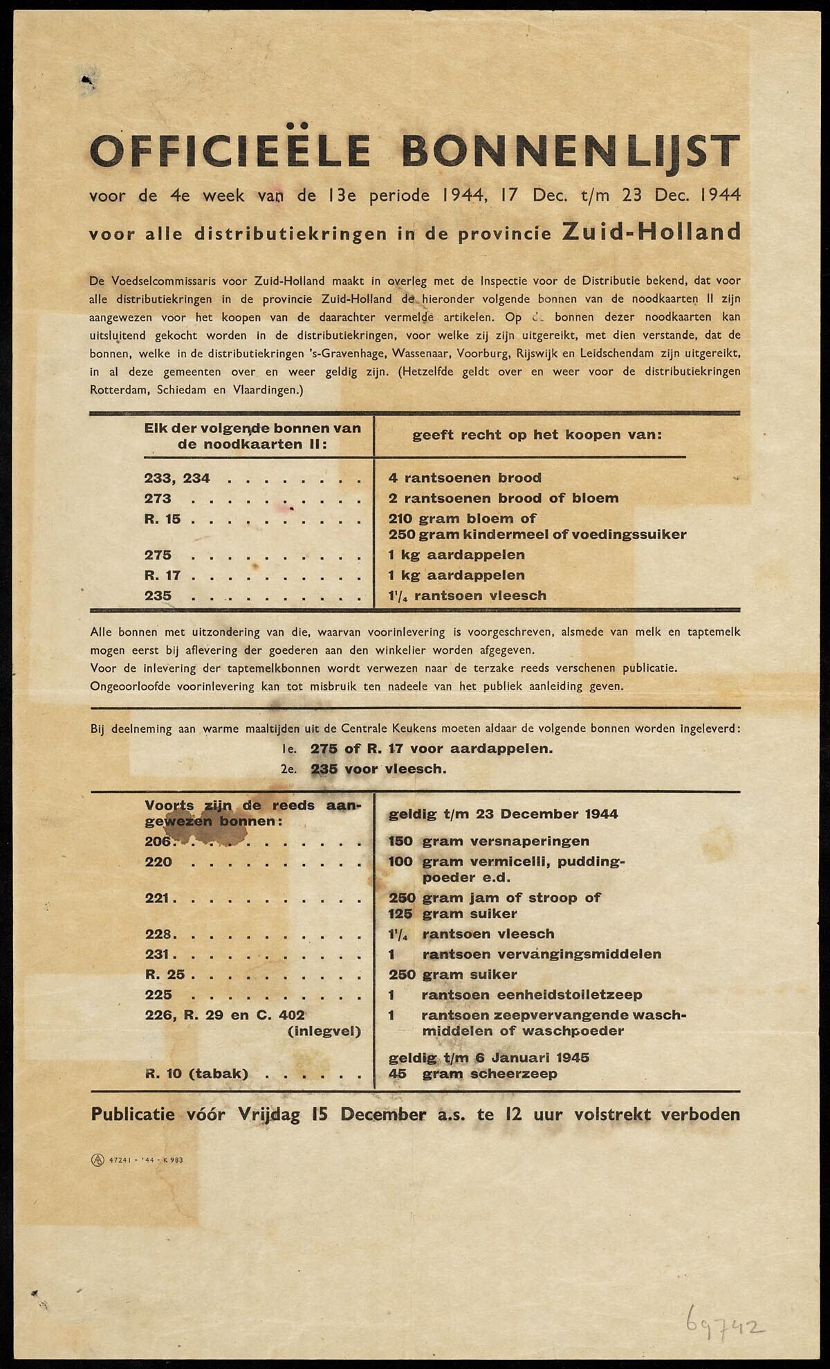 Een officieële bonnenlijst voor alle distributiekringen in Zuid-Holland voor de vierde week van de 13e periode 1944: 17 december 1944 - 23 december 1944.