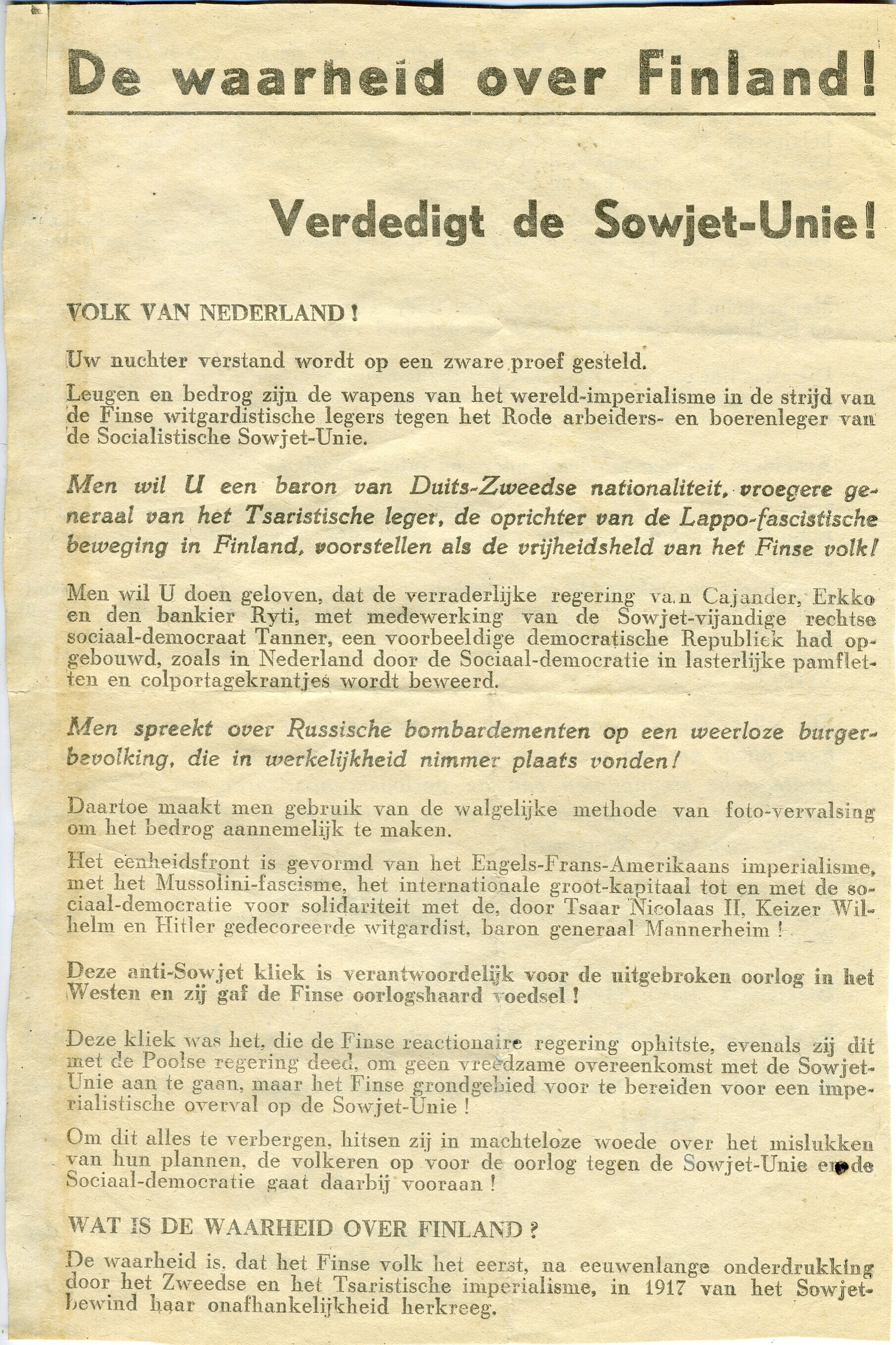 Een pamflet van de vereniging der vrienden van de Sovjet Unie die de Sovjet inval in Finland vergoelijkt.
