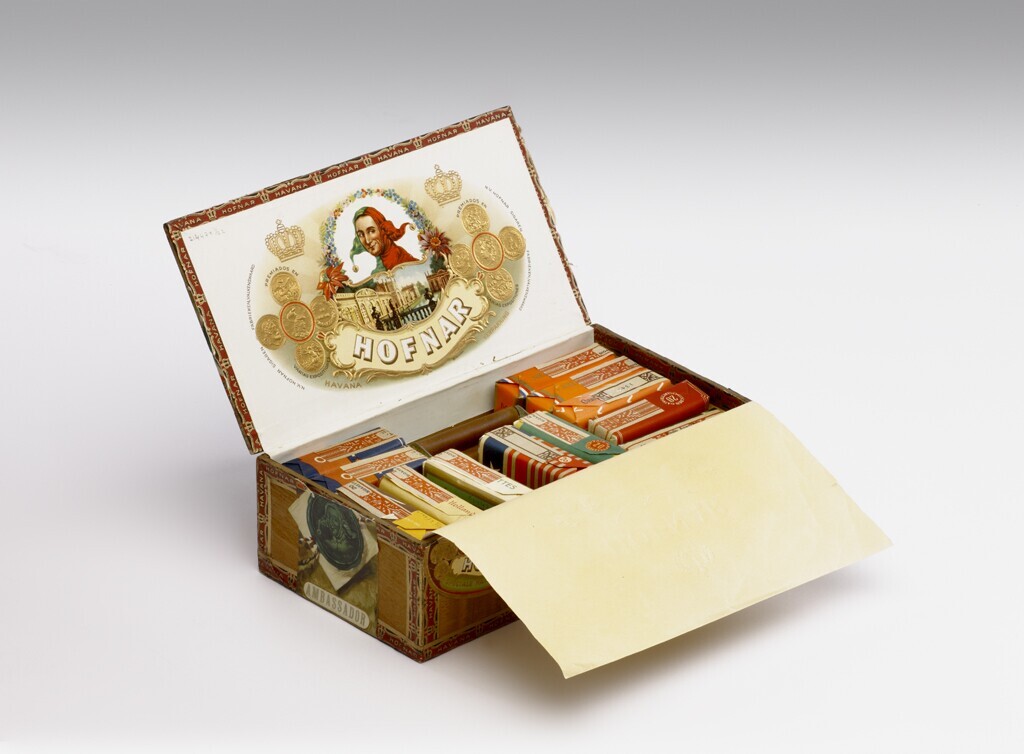 Een houten sigarenkist met logo en reclame etiketten van: "Hofnar Sigarenfabrieken N.V. Valkenswaard". In dit kistje 12 pakjes sigaretten van verschillende merken, 7 pakjes sigarettenpapier, 1 los Hofnar etiket en 1 hulpmiddel om handmatig sigaretten te rollen. Gedetailleerde beschrijving: - 1 etiket in een driehoek met het logo van Hofnar en o.a. de tekst: "Nooit fijner gerookt!"; - 7 pakjes sigarettenpapier, waarvan 1 aangebroken. Op de omslag rond het papier een zeilschip met een rokende zeeman en de tekst: "Compass finest quality cigarette paper" en de afbeelding van een kompas; - 2 onaangebroken pakjes sigaretten van het merk 'Smiles'. Op de banderol o.a.: "Made in Holland". De omslag is donkerblauw; - 2 pakjes sigaretten met en oranje omslag, waarvan 1 aangebroken. Het merk is: 'Jubilé' en is: "Speciaal vervaardigd ter gelegenheid van het gouden regerings-jubileum van H.M. koningin Wilhelmina". Op de banderol o.a.: "N.V. Crescent Cie Eindhoven"; - 1 onaangebroken pakje sigaretten met oranje omslag en witte 'V'-tekens. Op een zijde een zwarte 'W' daarboven "31 augustus 1941"en een kroon. Op de andere zijde: "Nederland zal herrijzen". Op de banderol o.a.: "+25 ct voor stichting 40/45"; - 1 onaangebroken pakje sigaretten met roodbruine omslag van het merk 'Golden Gate': "Made in Holland"; - 1 onaangebroken pakje sigaretten met donkergroene omslag van het merk 'Sailor'. Op de banderol o.a.: "Anglo American Cigarette Co. Eindhoven"; - 1 onaangebroken pakje sigaretten met groene omslag van het merk 'Fair Play'. Op de banderol o.a.: "Batschari den Haag"; - 1 onaangebroken pakje sigaretten met een omslag in de kleuren van de Amerikaanse vlag van het merk 'Whiston': "Atlanta Tobacco Co A'dam"; - 1 onaangebroken pakje sigaretten met deels bruin en deels gele omslag van het merk 'Flair': "N.V. London Viginia Tobacco Company Rotterdam"; - 1 onaangebroken pakje sigaretten met lichtgroen en gouden omslag van het merk 'Fifty Fifty': "British-American Tobacco Co. (Holland) Ltd"; - 1 aangebroken pakje sigaretten met gele omslag van het merk 'Broadway': "Made in Holland"; - 1 hulpmiddel voor het handmatig draaien van sigaretten bestaande uit een metalen houder met 2 houten rolletjes, die met elkaar zijn verbonden door een stuk bewerkt bruin textiel.