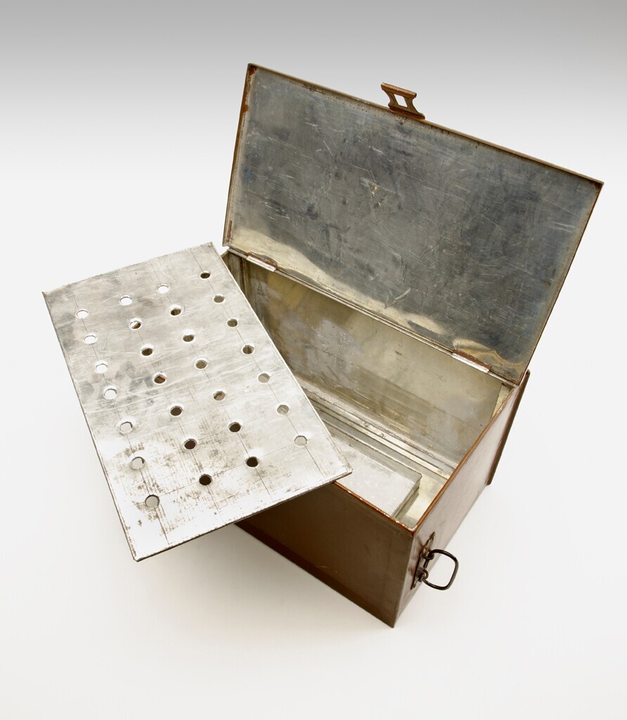 Een rechthoekige bruin gelakte blikken kist met in het midden een hangslot en aan de twee zijkanten zwart gelakte handgrepen. In de kist een losse blikken plaat met gaten en een vierkant laag blikken bakje. De kist werd gebruikt voor het laten fermenteren van zelf-geteelde tabak.
