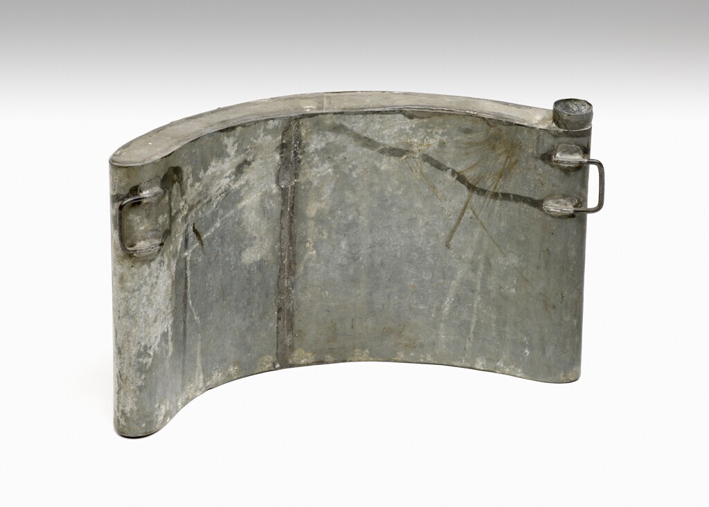 Een licht gebogen metalen keteltje voor het smokkelen van melk. Aan beide kanten zijn haakjes bevestigd met soldeer. Aan een kant is een opening. Het keteltje werd onder de kleding op de buik gedragen.