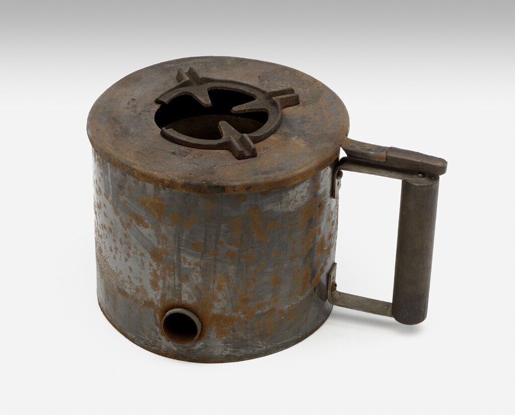 Hoog model noodkacheltje met een klein rond hulpstuk voor het neerzetten van een kleine pan en een deksel met ronde opening in het midden. De handgreep van het kacheltje en van de 'deksel' is van hout.