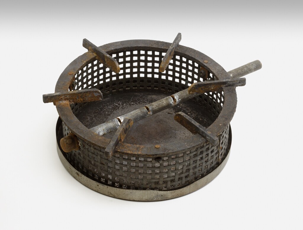 Een gasbrander met deksel. Van onderen opengewerkt. Door het onderste deel van de komfoor loopt de gasbuis.