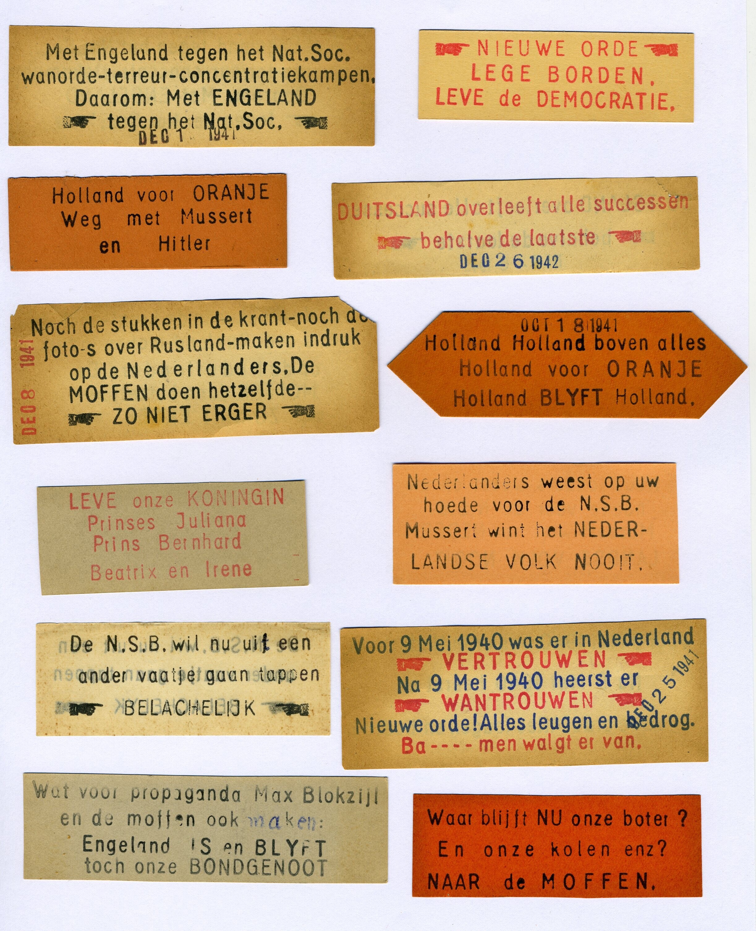Een serie van 40 kleine stukken papier met gedrukte leuzen onder meer tegen de Duitse bezetting van Nederland. Een aantal is voorzien van datum stempels.