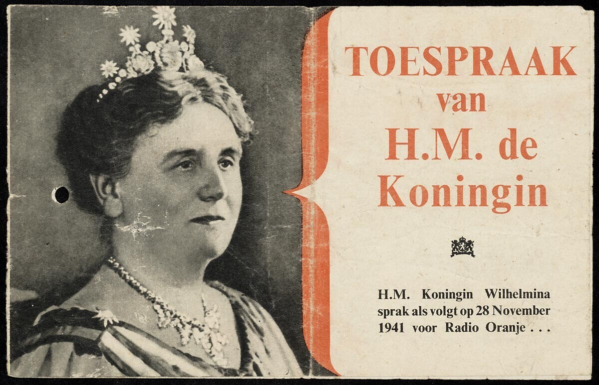 Een gedrukt pamflet met het portret van Koningin wilhelmina en: "Toespraak van H.M. de Koningin. H.M. Koningin Wilhelmina sprak als volgt op 28 November 1941 voor Radio Oranje..."<br>