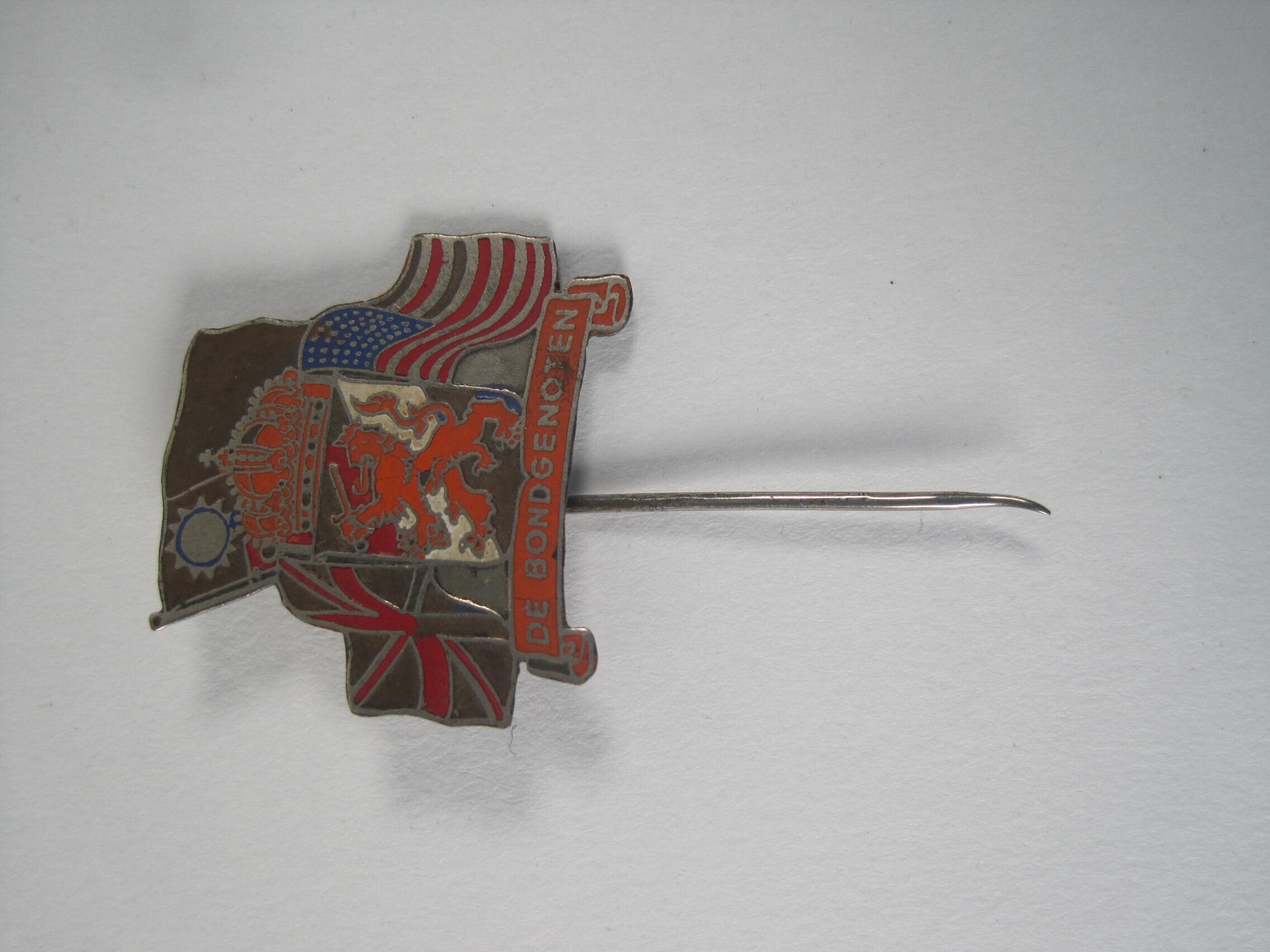 Een metalen speldje met de afbeelding van het 'Wapen van het Koninkrijk der Nederlanden' te midden van de vlaggen van drie geallieerde mogendheden Engeland, Amerika en de Republiek China. Hieronder de tekst "De bondgenoten".