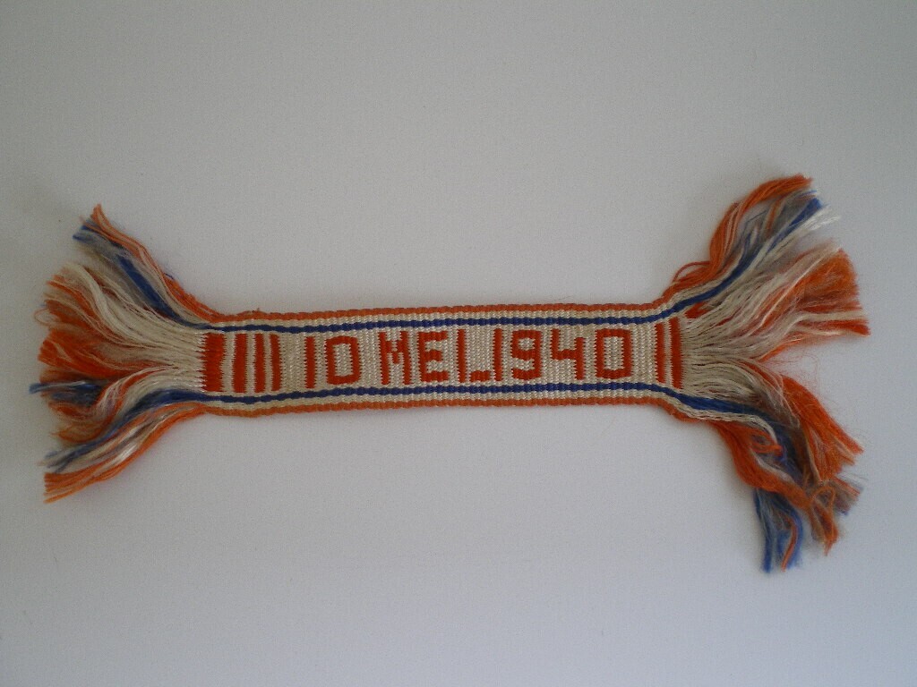 Een geweven strook in de kleuren wit, oranje en blauw met aan de uiteinden franjes. Op de strook in oranje de datum: "10 Mei - 1940". Vermoedelijk gebruikt als boekenlegger.