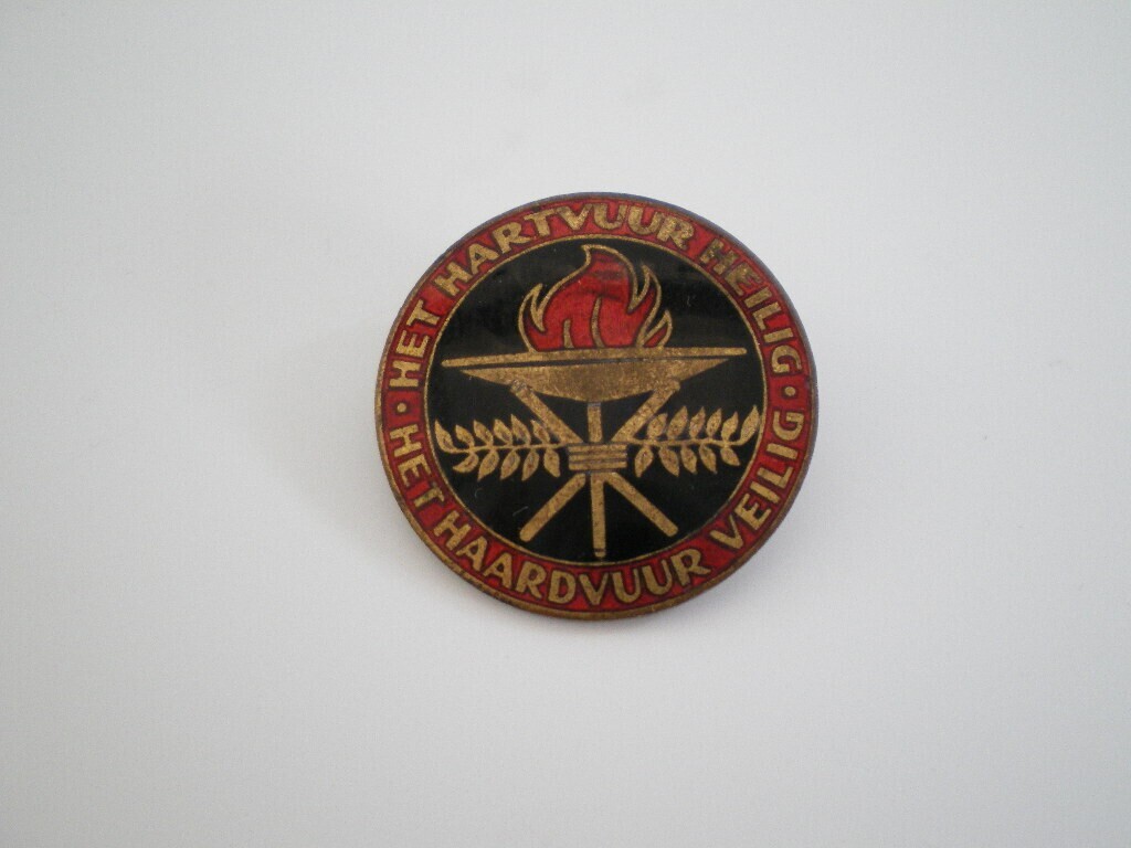 Een goudkleurig rond metalen speldje van leden van de Nationaal Socialistische Vrouwenorganisatie (NSVO) met in rood en zwart email de afbeelding in een cirkel van een brandende vuurschaal op een driepoot met aan weerszijden lauriertakken. Rond de afbeelding de tekst: "Het hartvuur heilig. Het haardvuur veilig”.