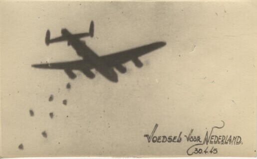Een zwart-wit foto van een vliegtuig, dat pakketten uitwerpt. Rechtsonder: "Voedsel voor Nederland 30.4.45".