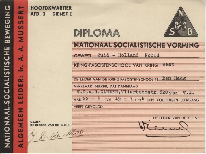 Een diploma gedrukt op dik papier met het logo van de N.S.B. en o.a.: "Diploma Nationaal-Socialistische Vorming Gewest Zuid-Holland Noord Kring-Fascistenschool van Kring West. De leider van de Kring-Fascistenschool te Den Haag verklaart hierbij, dat kameraad W.G. v.d. Zanden, Vlierboomstr. 620 STBK V.L. van 22-4- tot 15-7 1936 den volledigen leergang heeft gevolgd".