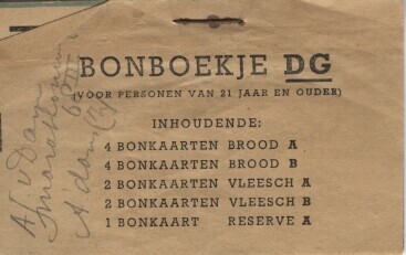 Een bonboekje bestaande uit enige velletjes dun papier, bijeengehouden door een nietje. Op het voorvel in zwart gedrukt: "Bonboekje DG (Voor personen van 21 jaar en ouder) Inhoudende: 4 bonkaarten Brood A; 4 bonkaarten Brood B; 2 bonkaarten Vleesch A; 2 bonkaarten Vleesch B; 1 bonkaart Reserve A". In potlood: "A.J. v. Dam. Marathonweg 68 III A'dam (Z)". Alle bonnen zijn gedateerd: 28 dec. 1941 - 21 mrt 1942. Behalve een aantal reserve bonnen, zijn alle bonnen afgescheurd. Alleen de bovenkant met de datering en de naam van de bon is nog zichtbaar.