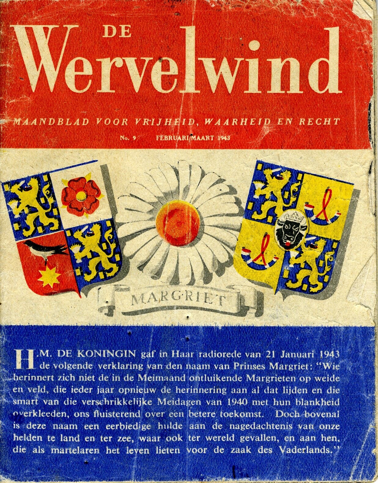 Een exemplaar van een klein met zwart-wit foto's geïllustreerd drukwerk. Op de voorpagina de afbeelding van de Nederlandse vlag met in de witte baan twee wapenschilden en een witte bloem met geel hart. Onder de bloem: "Margriet". Tevens de tekst: "De Wervelwind. Maandblad voor vrijheid, waarheid en recht. No. 9. Februari/Maart 1943. Op de achterkant o.a.: "Lezen en doorgeven!".