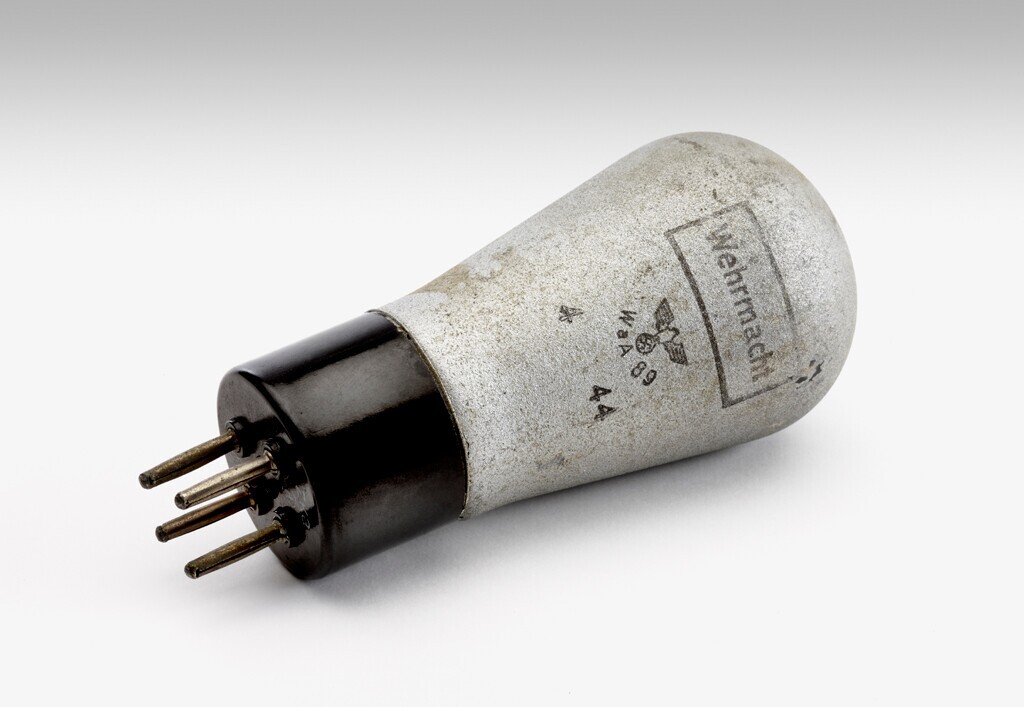 Een Duitse radiobuislamp met opschrift: "Wehrmacht Wa A 89 44". fabrikaat "Telfunken (RES 094)". Opdruk van een swastika.