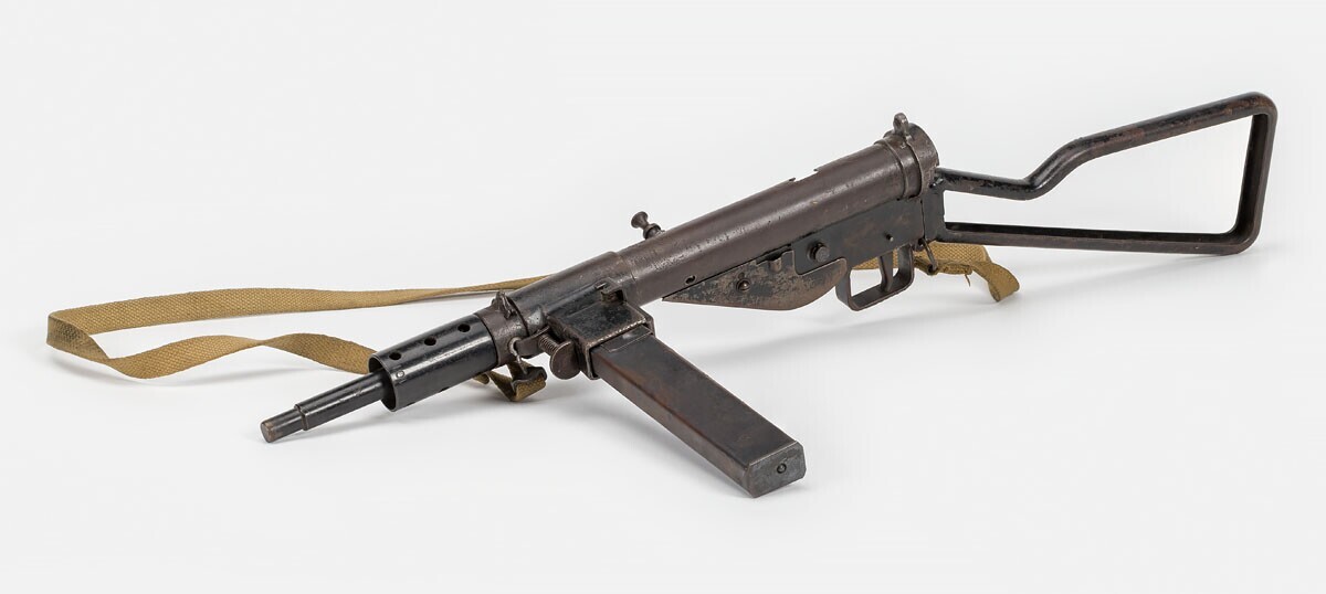 Een mitrailleur van het type "Stengun" met bijbehorend magazijn en canvas draagband.
