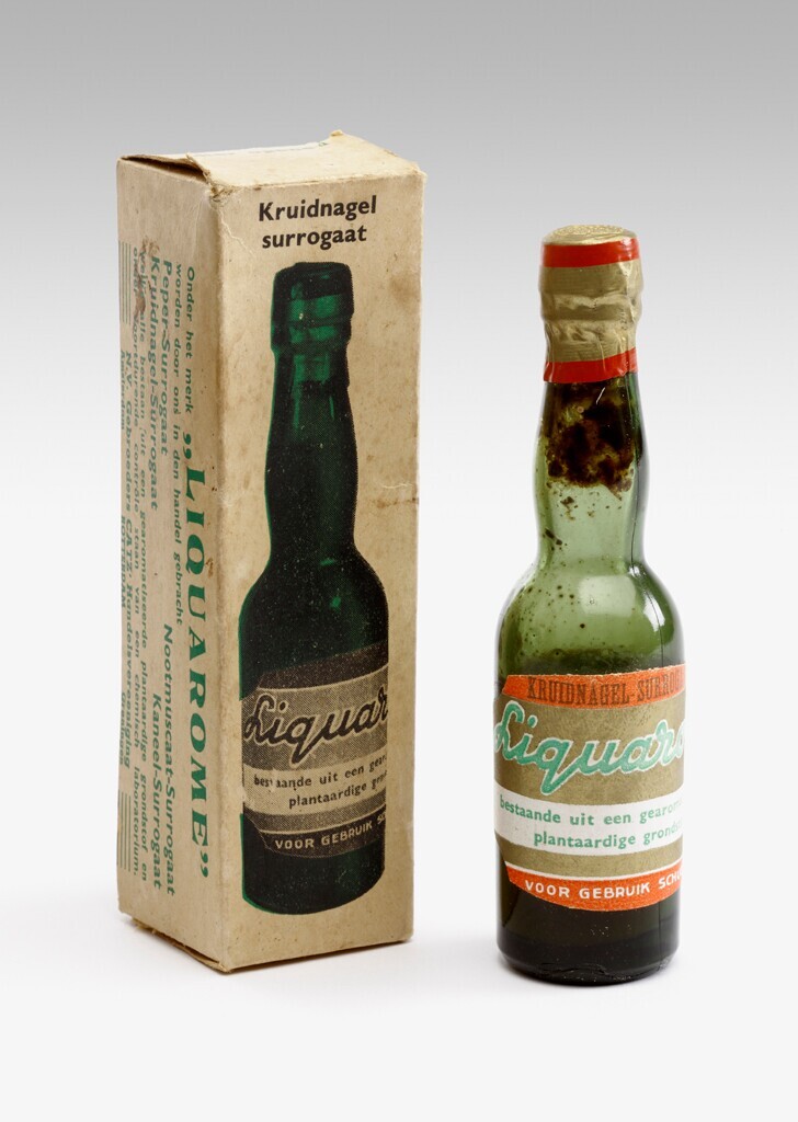Een hard papieren rechthoekige doos met daarop de afbeelding van een flesje kruidnagelsurrogaat van het merk: "Liquarome". Het doosje bevat nog de originele fles.